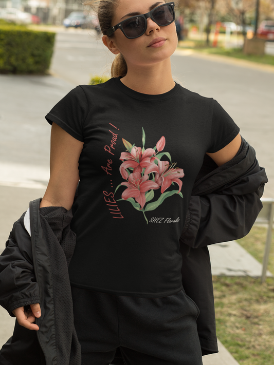 Shez Florals, Red Lilies Black Oversized Printed T Shirt Women