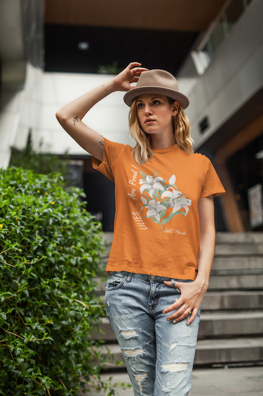 Shez Florals, White Lilies, Orange Printed Oversized T Shirt Women