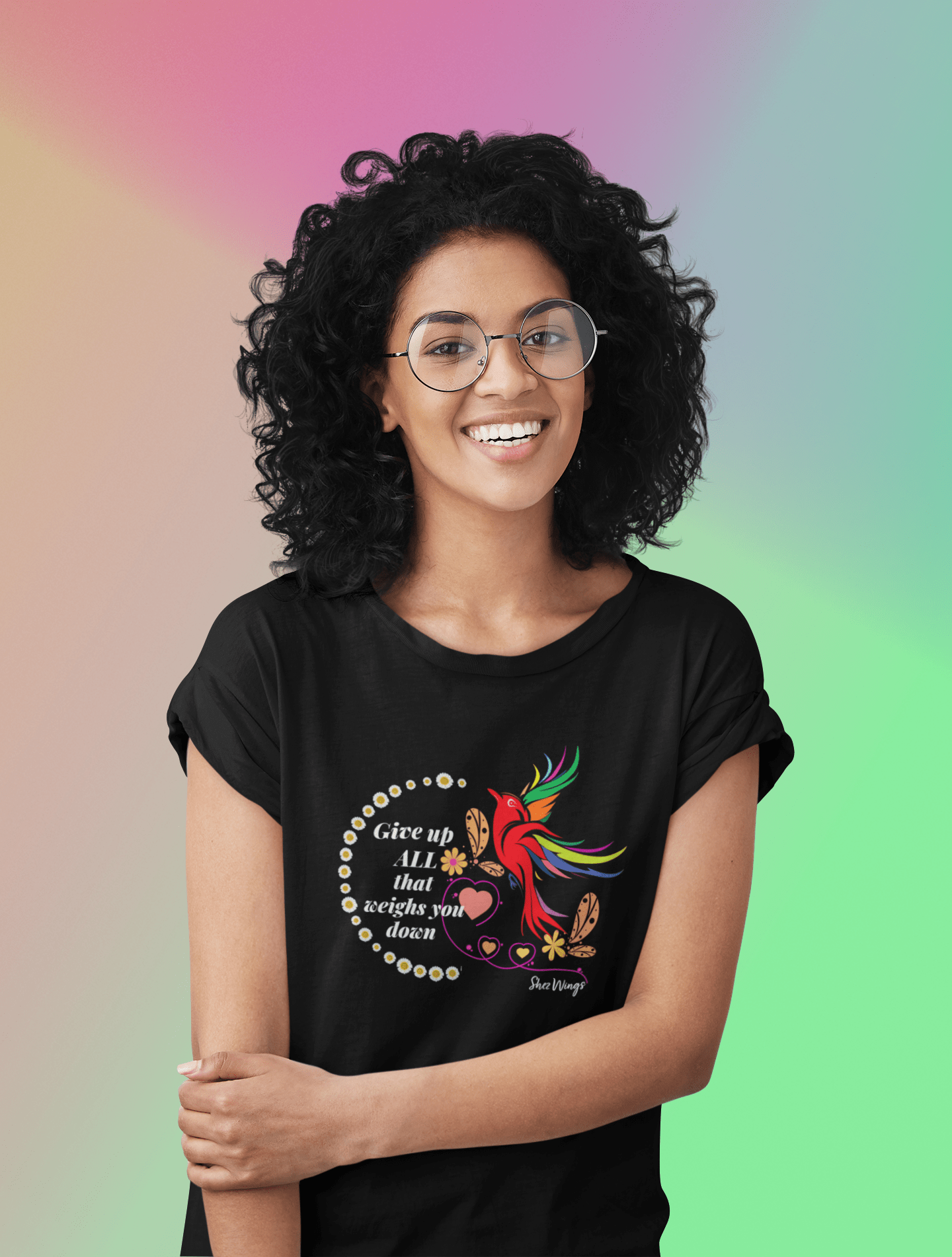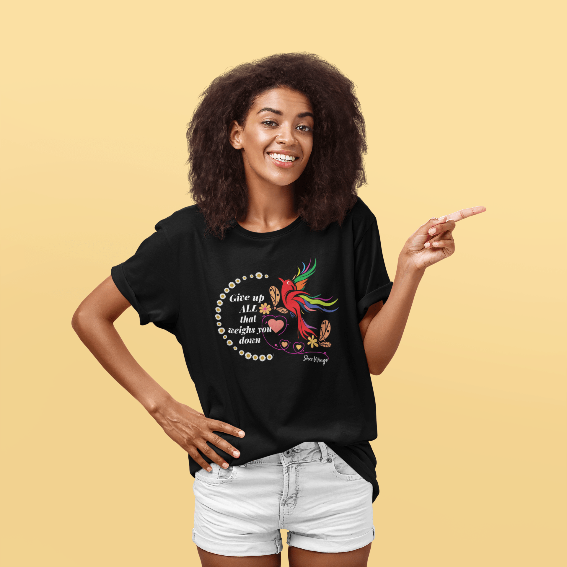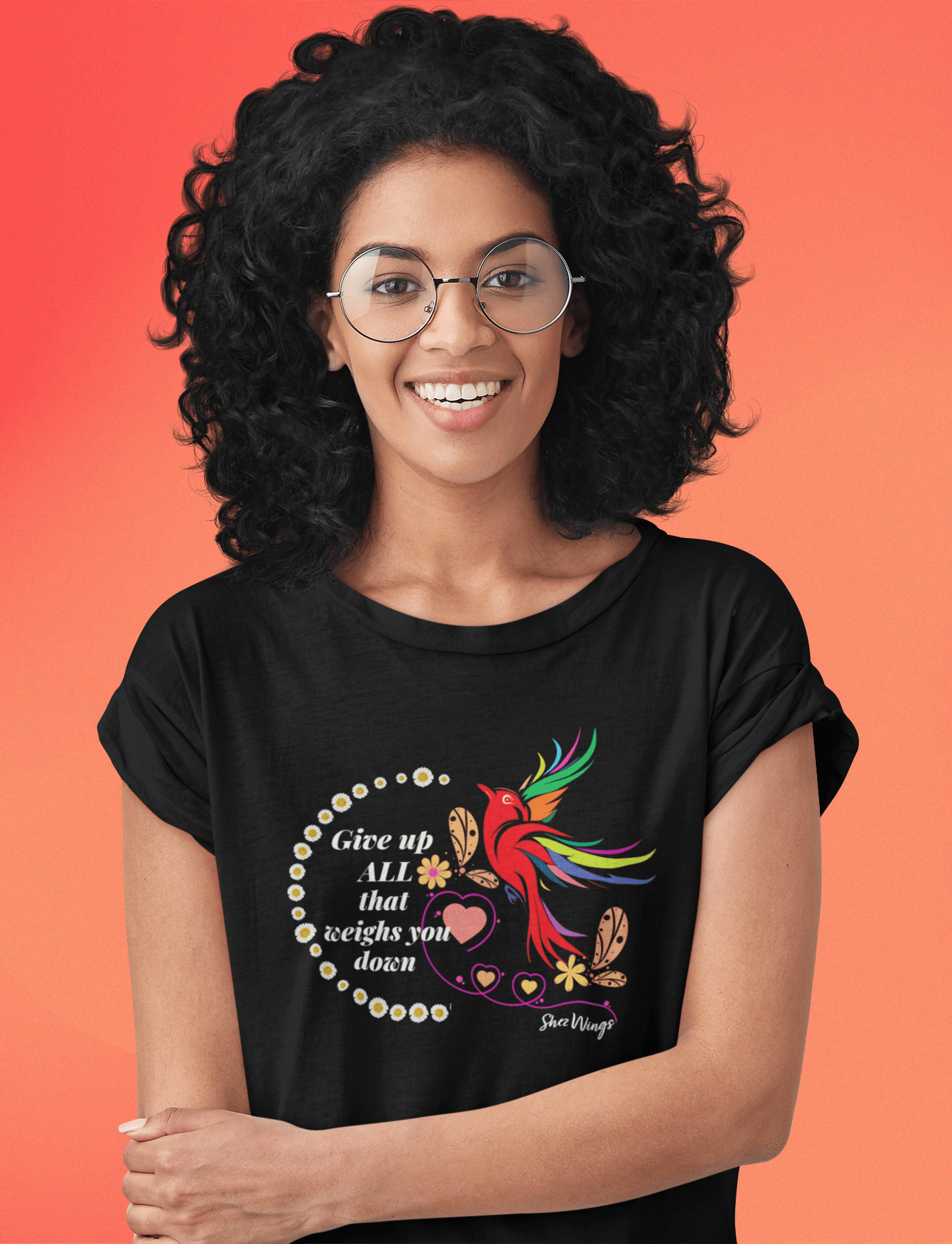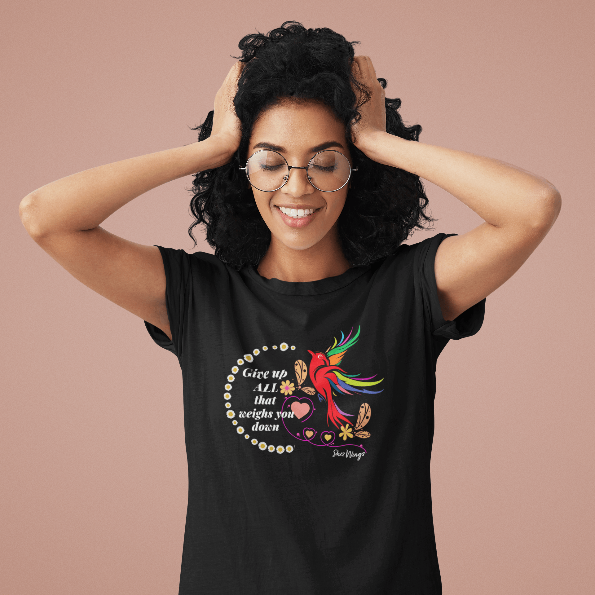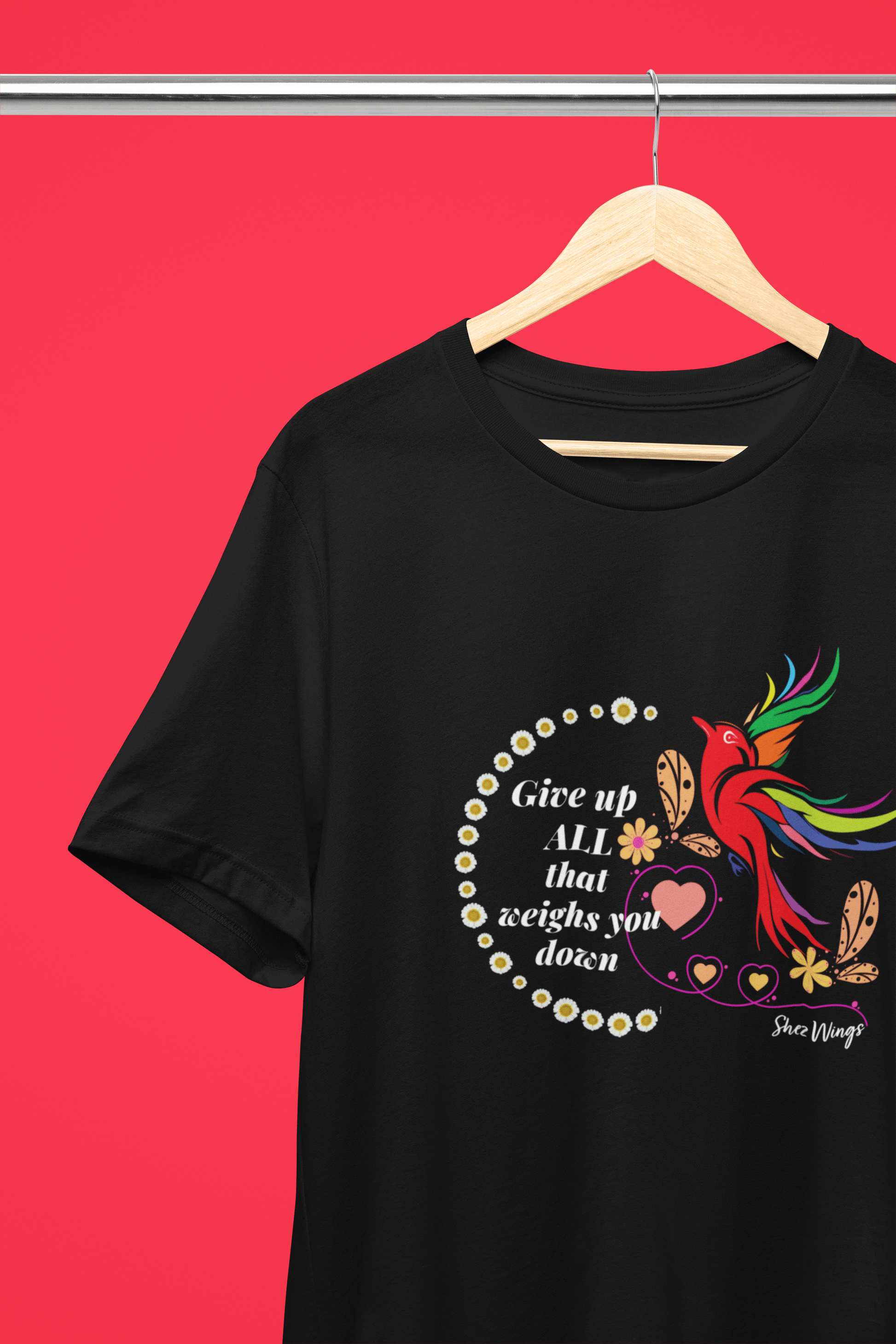 Experience the freedom of release with Shez Wings "Give Up All That Weighs You Down" Oversized Printed Women's T-shirt.